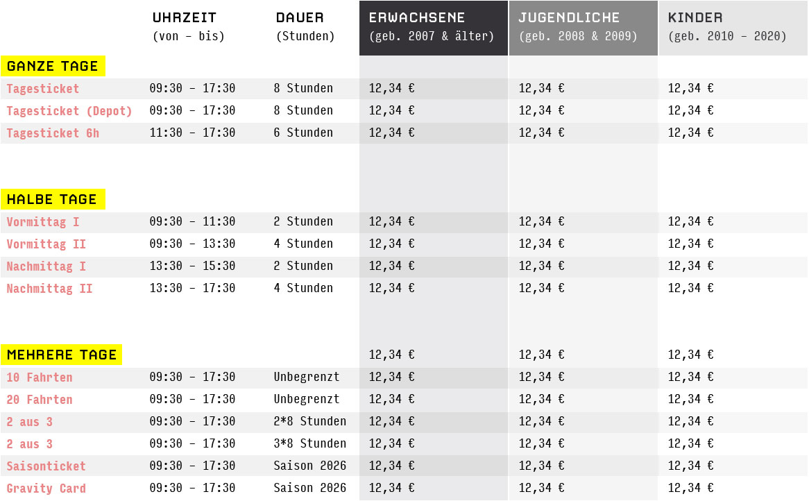 Wir staffeln unsere Ticketpreise nach Geburtsjahren - unabhängig von Deinem genauen Geburtsdatum. So ist es für Dich schnell und eindeutig. Für unsere Tickets gelten aktuell: